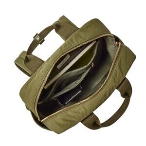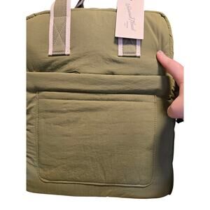 Green canvas backpack with cream accents on straps and gold hardware. Comfortable straps and spacious bag that can accommodate a 14-inch laptop! Handy front pocket for all the things you need to reach easily.