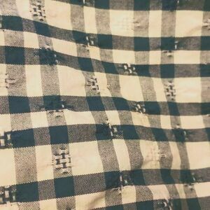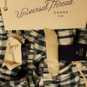 Universal Thread green and white checkered blouse. Relaxed fit with pullover style. Elasticized high collar, wide yoke with a ruffle. 3/4 balloon sleeves end in elastic. Dark green and white checkered gingham textured cotton make up this versatile blouse.