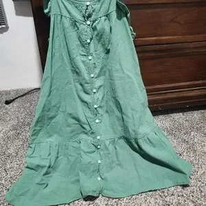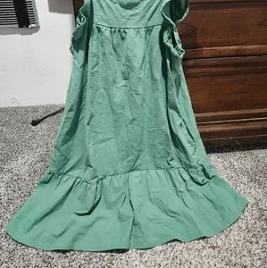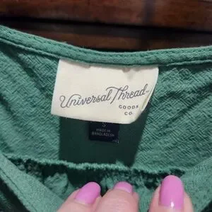 This chic green sundress by Universal Thread features a ruched design and a stylish backless cut, perfect for casual or resort wear. The sleeveless dress is crafted with spaghetti straps, offering a breezy and comfortable fit for warm days. Its midi length adds a touch of elegance to its relaxed style.