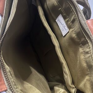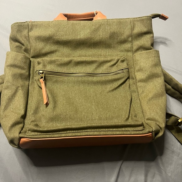 The Universal Thread backpack combines a classic green and tan color palette with a rugged, utilitarian design. Crafted from durable materials, it features leather trim details and a structured silhouette, making it a versatile choice for everyday adventures.