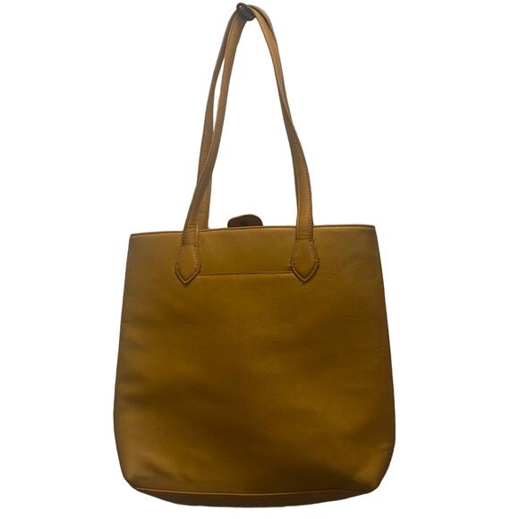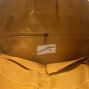 Goldenrod colored handbag. Large enough to carry laptop and accessories. Zipper pocket and 2 accessory pockets inside. Button close.