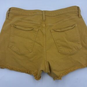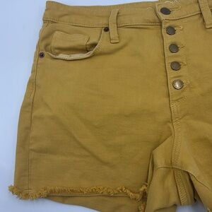 Gently worn - cotton-blend denim fabric shorts with button fly, distressed, raw hem; and classic 5-pocket design. Waist measurement approximately 15.5”, inseam 3”.
