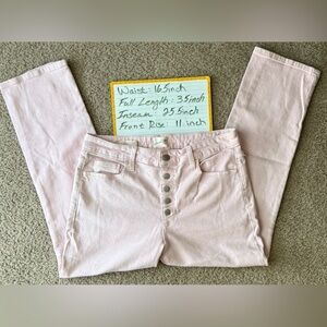 Chic high rise jeans in a soft pink hue. Features button-up front. Perfect for casual wear.