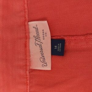 Lightweight, high waisted, denim utility shorts in a faded coral red color. Single button and zipper closure. Belt loops. Two large diagonal front pockets and two large back patch pockets. 100% cotton.