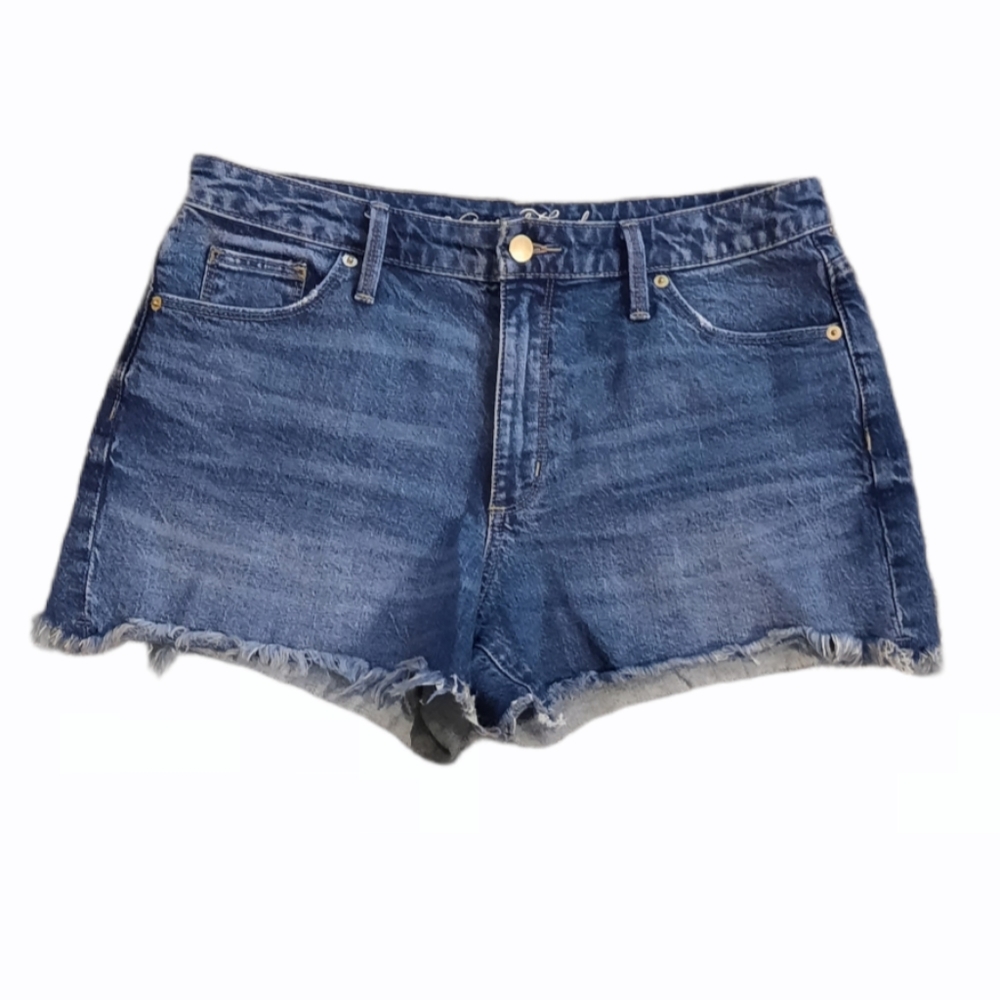 Excellent pre-owned condition, High Rise, frayed hem, medium wash, light distressing on pockets, soft worn in feel, very little stretch.