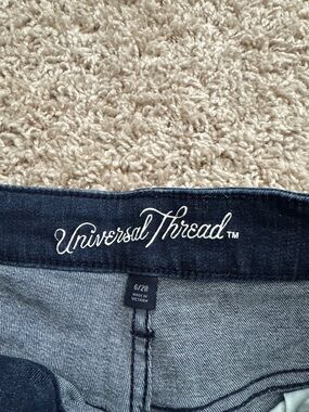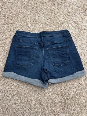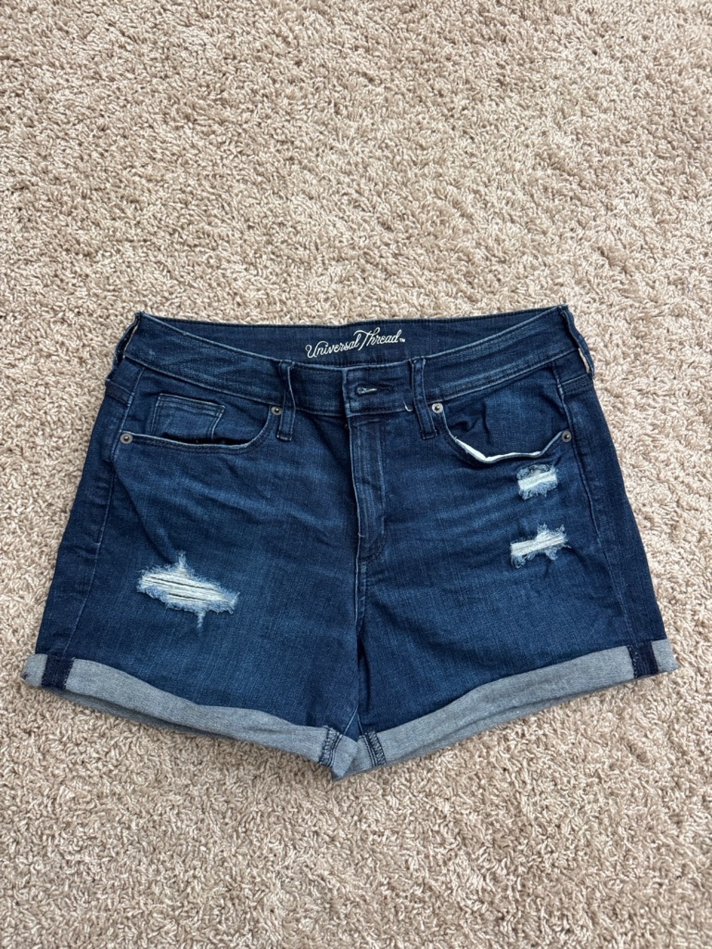 Dark wash shorts with destroyed detail and roll up at the bottom.