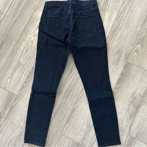 Dark Wash High Rise Skinny Jeans. Rise is 9” and inseam is 28”.