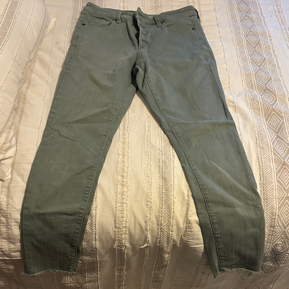 Chic teal jeans with button-fly closure. Ideal for everyday style.