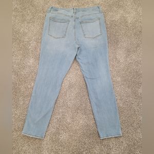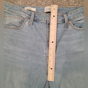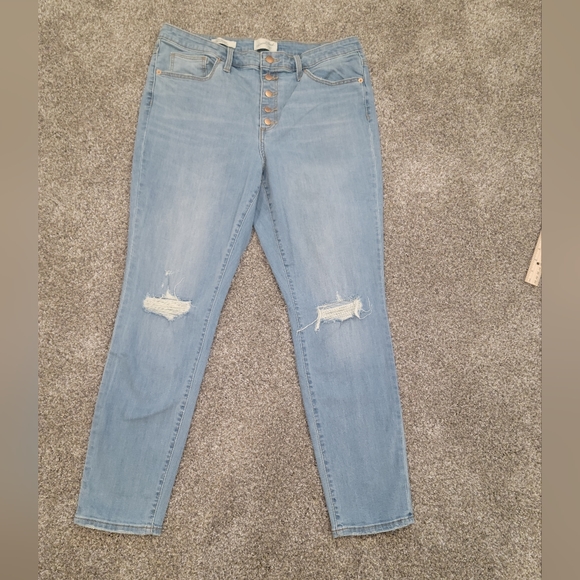 Like new - perfect condition! High rise skinny jeans with button fly and distressing on knees. Light wash denim. Stretchy and comfy. Size 16/33.