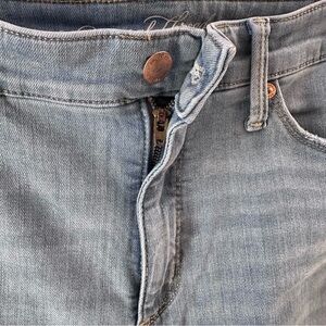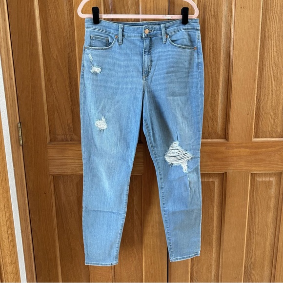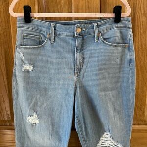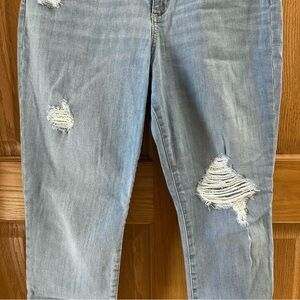 Distressed high rise skinny jeans with real front and back pockets and zip & button closure. In excellent condition. The color of the jeans is most accurate in the first picture.