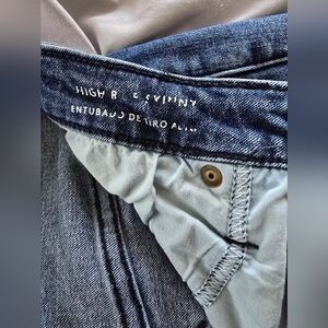 No rips, stains or defects. They are high waisted and medium dark wash. The fabric does have some stretch.