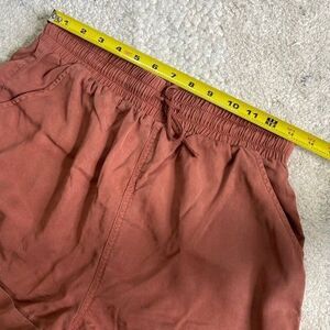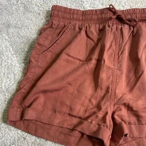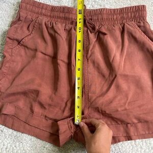 These high-waisted shorts from Universal Thread feature a warm brown hue and a comfortable elastic waistband with a drawstring. Crafted from a soft, textured fabric, they offer a relaxed fit perfect for casual wear.