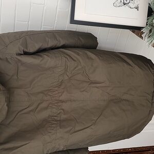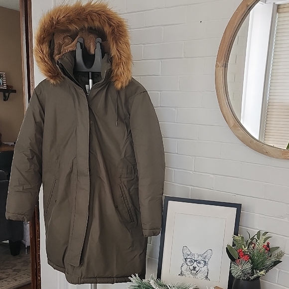 Stylish olive green parka featuring a cozy faux fur hood. Perfect for cold weather. nice and heavy. like new.