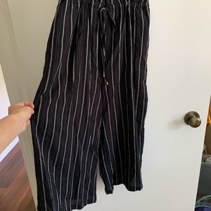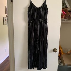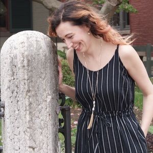 Super cute jumper. Length hits about mid calf. Has pockets and a cute ruffle detail at waist with a tie with gold beads. Lightweight linen-like material. Black with white and light blue stripes. Adjustable straps.
