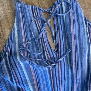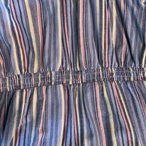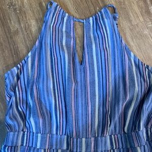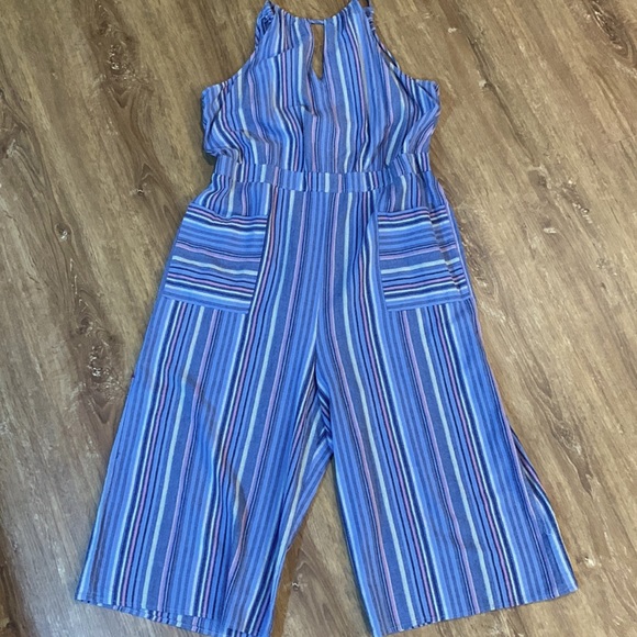 Chambray colored stripe jumper . Elastic back , drawstring adjustable at back of neck . Can pull it tight or adjust to be worn looser . Can be worn over t shirt or without has full coverage . Fits like a true 14 . Wide legs and big pockets at hips hits mid calf . Like condition , worn few times
