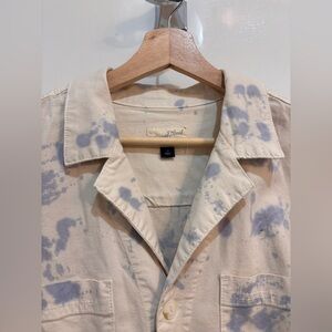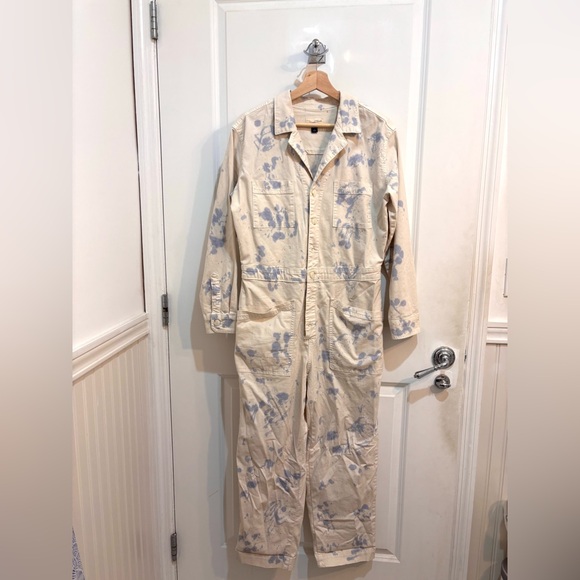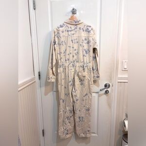 Super cute cream jumpsuit with blue splatter pattern. Really soft and comfy. Excellent condition. Only worn once.