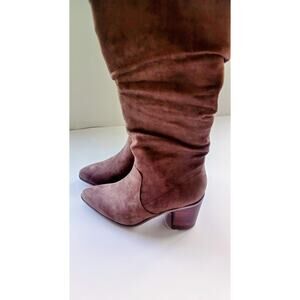 These Universal Thread Women's Junie Tall Boots are a stylish and comfortable addition to your footwear collection. Designed in a rich brown hue, these boots feature a tall shaft with a slightly slouchy, gathered look that adds a touch of casual elegance. The side zipper ensures easy on and off, while the block heel provides a comfortable lift without sacrificing all-day wearability. Crafted from a soft, suede-like material, these boots offer a luxurious feel against the skin. Perfect for fall and winter, these boots pair well with jeans, skirts, or dresses, making them a versatile choice for any occasion. The boots are available in various sizes.These are a great choice for women who appreciate both style and comfort.