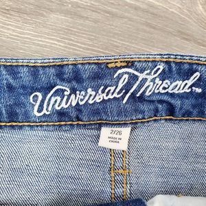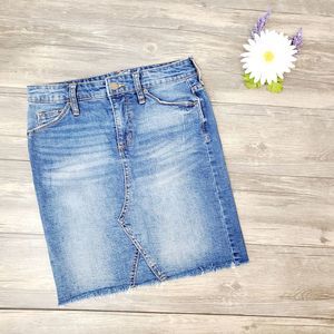 Universal Thread Medium wash denim skirt. Fits about knee length. 5 pocket style with raw hemline. True to size. This item is in excellent preowned condition. Ready to wear.