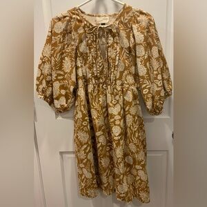 Universal Thread 3/4 large puff sleeve light loose-fitting dress; knee length; scoop neck with single tie; golden mustard with large cream-colored floral pattern; gathered upper front bodice, a-line; 2 large hidden side pockets; 100% cotton; machine wash nd dry; S