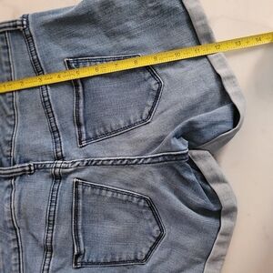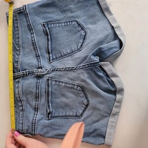 light blue denim shorts. Comfortable and stylish. Ideal for everyday wear.