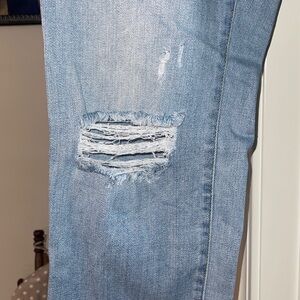 Casual and comfortable fit. Light blue with distressed details. Ideal for everyday wear. In good preowned condition from a smoke free dog friendly home.