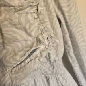 Stylish light blue blouse with a subtle pattern. Features long sleeves and a smocked waist. Perfect for casual wear.