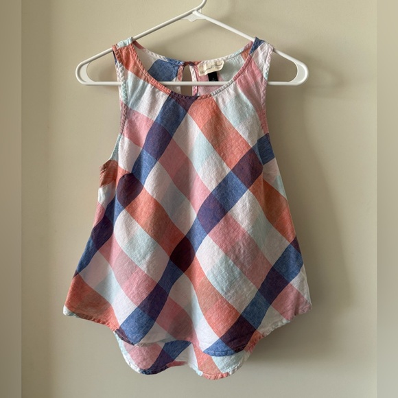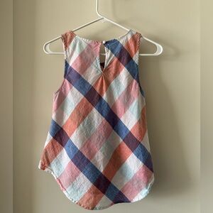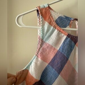 Universal Thread linen blend tank top, high neckline, bra-friendly, relaxed fit with no stretch, red white and blue plaid print, rounded hem, cotton/linen blend, very lightweight, button closure at back with keyhole opening detail. Women's Size Small