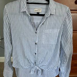 This lightweight button down top features a tie in the front and works great as a coverup or pairs well with brightly colored shorts! Such a great piece for this summer
