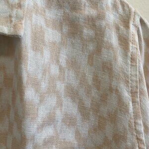Shirt has been dry-cleaned, pressed, and is in near perfect condition. Fabric is a linen blend. Pattern is like a wavy pink checker board.