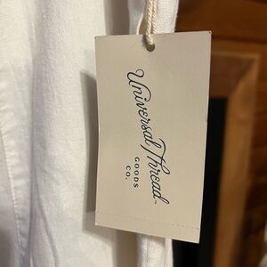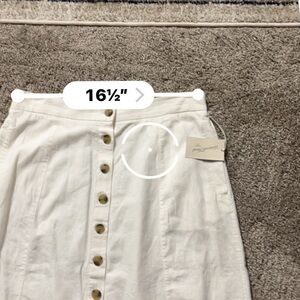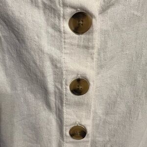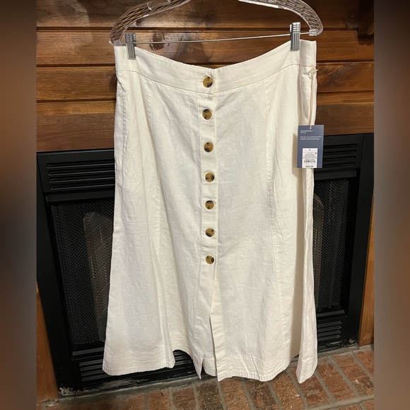 A-line off white linen skirt with button-front design. Side pockets. Elastic waistband in the back. Lightweight, tailored look. New item (29 inches from waist to bottom hemline)