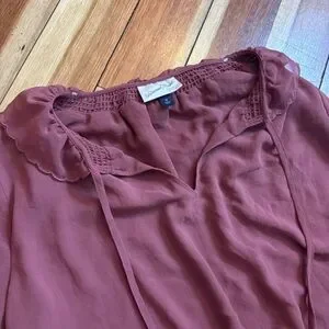 Elegant blouse with ruffle accents. Soft, textured fabric. Ideal for any occasion.