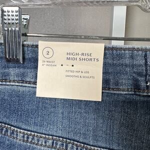 Women's Distressed High-Rise Midi Denim Shorts by Universal Thread, US Size 2/26, Medium Wash Jean Shorts, Blue, Raw hem, Distressed detailing, Zip with button closure, Denim, 5 Pocket Styling, Belt Loops. Casual Shorts.