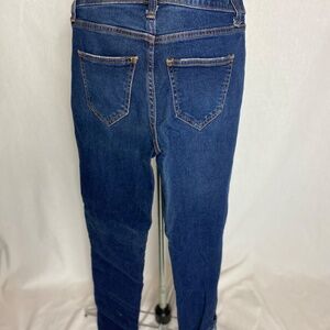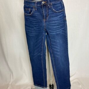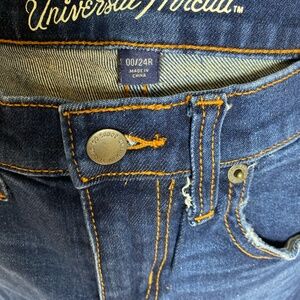 Universal thread indigo denim, mid-rise girlfriend fit, cropped with stretch. Zipper and button fly. Size 00/24. Only worn a few times. Very comfortable.