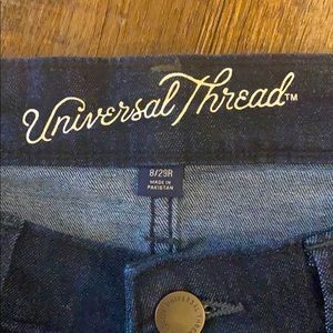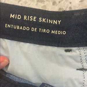 Universal Thread (Target Exclusive Brand) mid rise, dark wash skinny jeans. Very comfy, only worn once as I prefer a higher rise. These hit me (5’4”) right below the belly button