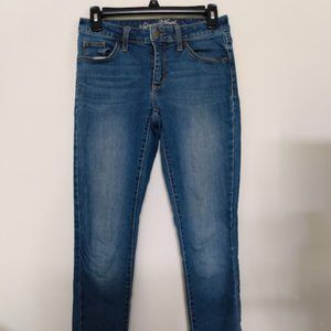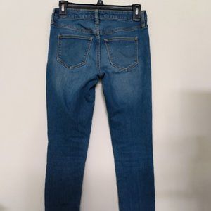 Women's 2R. Very good worn condition. Five pocket styling. Med/dark wash. Cotton/poly/span blend. Approx. 13.5" waist flat, 30" inseam, 9.5" rise.