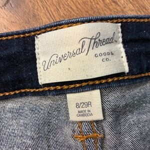 Universal Thread mid rise skinny jeans. Dark wash. Size 8/29. One minor flaw shown - a few light spots by seam. Otherwise great condition. Approximate measurements shown. Smoke free home.
