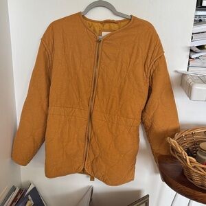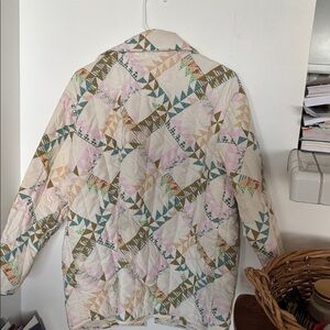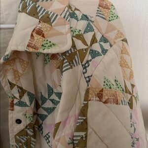 Chic patchwork design with multicolor patterns. Ideal for layering. Adds flair to any look. Quilt inspired. Not actually made of quilts. Please note stain on back in last picture. Stain doesn’t seem to watch off. This is reflected in price. Fits a size large a loosely.