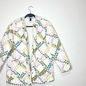 Stylish quilted jacket with geometric patterns. Features a blend of soft colors. Perfect for layering.