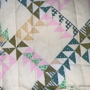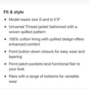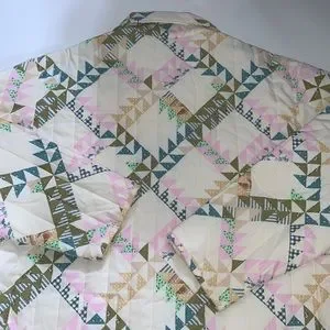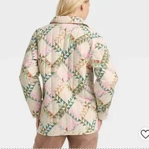 Stylish quilted jacket with geometric patterns. Features a button-up front and side pockets. Perfect for layering.