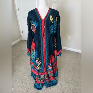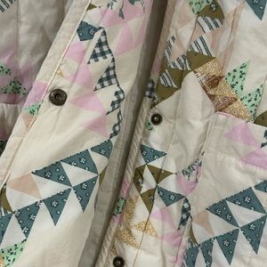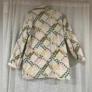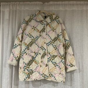 Stylish quilted jacket with geometric patterns. Features button closure and cozy design. Perfect for layering.
