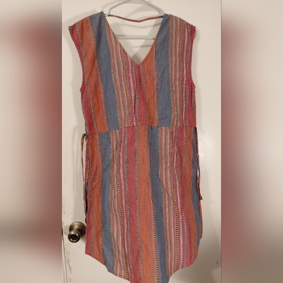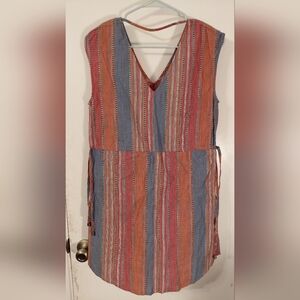 Vibrant dress with multicolor stripes. Sleeveless design with a stylish V-neck.