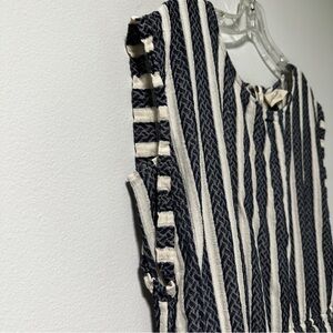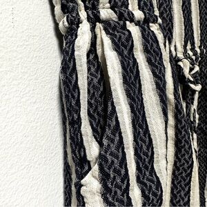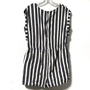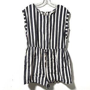 Navy blue and white textured vertical stripe romper. Has pockets. Features an exposed zipper back closure, and lined shorts. Micro cap sleeves, short length. Great spring and summer piece! Pre-owned in excellent condition, no holes or stains.