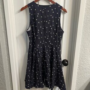 Stylish navy mini dress with button-front design. Features a sleeveless cut and subtle pattern. Ideal for everyday wear.