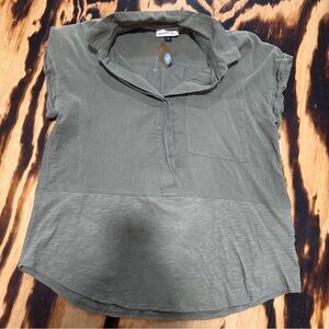 This Universal Thread blouse in a sophisticated olive green, hue features a boxy silhouette with a classic polo collar and cap sleeves. The buttoned design adds a touch of elegance, making it a versatile piece for any casual occasion. This shirt is 100% cotton very comfortable.