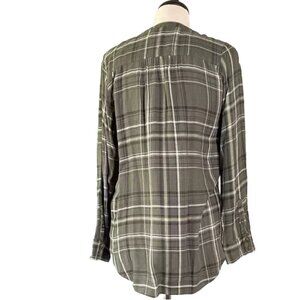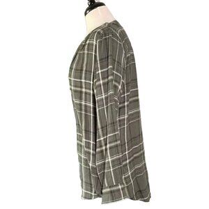 Chic olive plaid shirt with button-down front. Long sleeves and relaxed fit. Ideal for everyday wear. Collarless, ultra soft and lightweight flannel.
