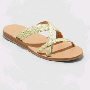 Universal Thread sandals. Sage green braided raffia comprises the straps on this slide. 1 inch wedge for lift. Open toe design. Great for a beach vacation!