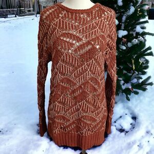Universal Thread Open Knit Sweater NEW S Clay Pullover Crochet Asymmetric Rustic. Condition is new with tags. The color is a clay rustic red color. Asymmetric Hem. Open Knit. Please see measurements!! No rips, tears, holes or discolorations.