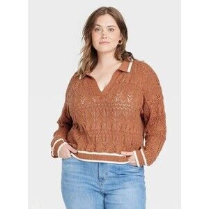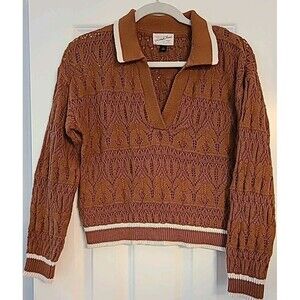 Universal Thread Orange Camel Rust Crochet Polo V-neck Crop Varsity Sweater Sz S