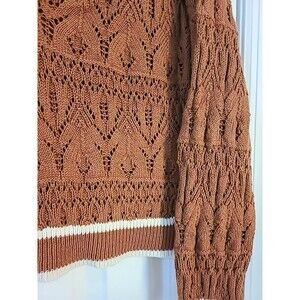 The Universal Thread Orange Camel Rust Crochet Polo V-neck Crop Varsity Sweater in size S is ready to weark fo school, casual outings, or workwear. Made from 100% cotton with an open crochet knit, this sweater features a collared neckline, long sleeves, and a pullover style with ivory stripe accents on the trim. Measures 19 in across the bust and 19 in length. Excellent condition.