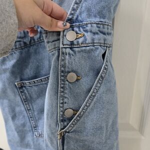 Light blue wash overall shorts with raw folded hem.
